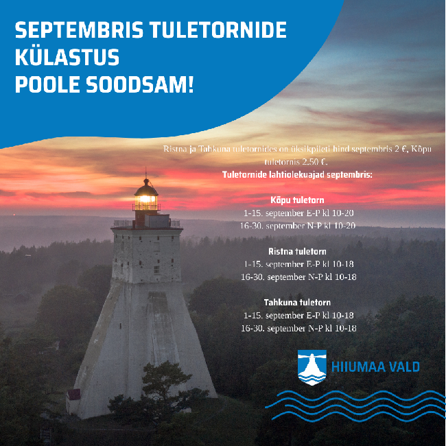 Merenduskuu 2025 raames on üksikpileti hind Hiiumaa tuletornides 50% soodsam. Ristna ja Tahkuna tuletornides on üksikpileti hind septembris 2 eurot, Kõpu tuletornis 2.50 €.