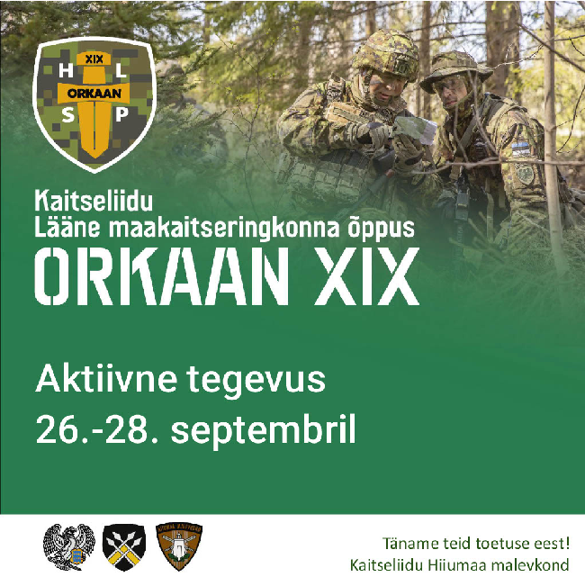 Kaitseliidu Lääne maakaitseringkond korraldab 18.-28. septembril iga-aastase suurõppuse Orkaan XIX. Õppusel osalevad Kaitseliidu Lääne maakaitseringkonna võitlejad, reservväelased, kaitseväelased...